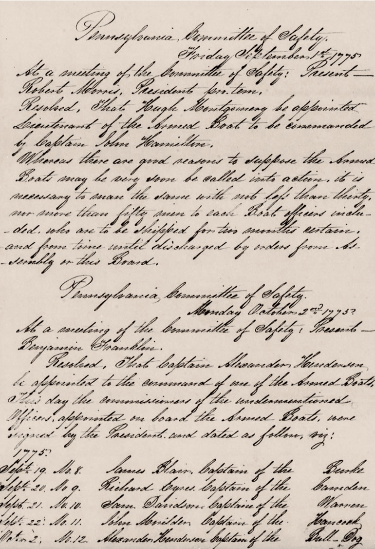 Alexander Sr’s commission as Captain of the Bulldog, October 2, 1775. The Pennsylvania Navy’s fleet of 48 ships included 13 row galleys, each armed with one cannon. Their mission was to patrol the Delaware River and protect the colony’s capital, Philadelphia, against the incursions of British naval vessels.