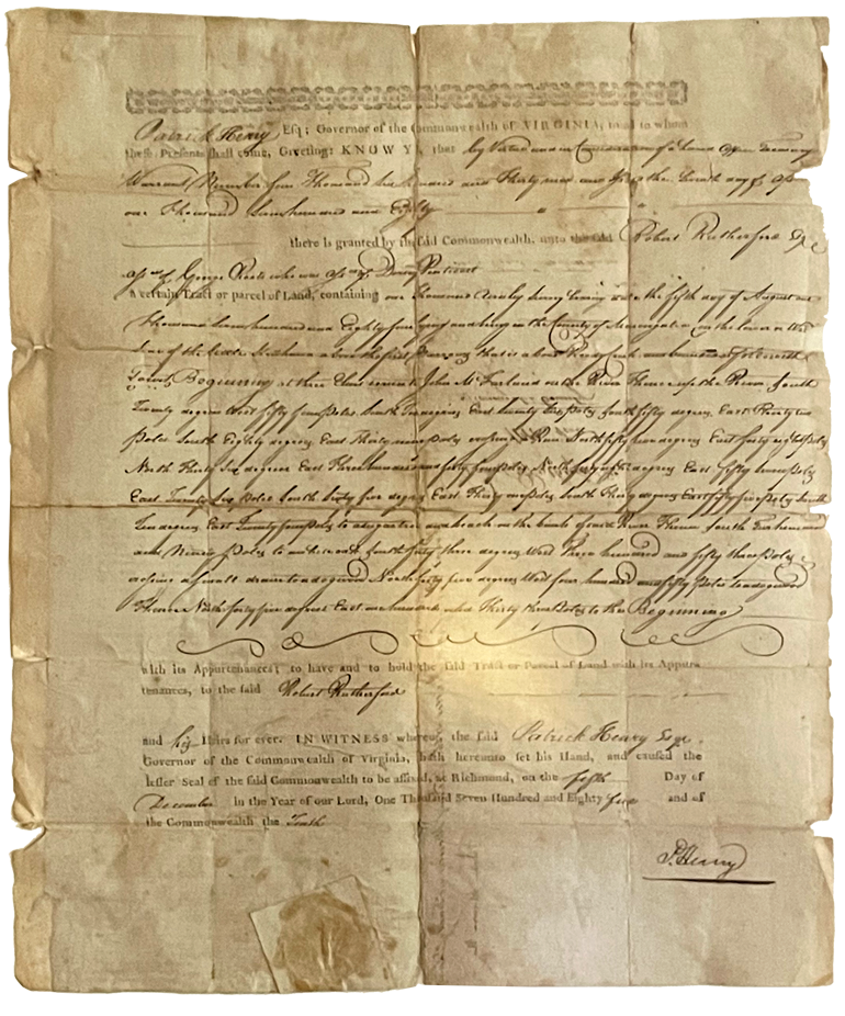 This land deed signed by Patrick Henry hangs in Henderson Hall.