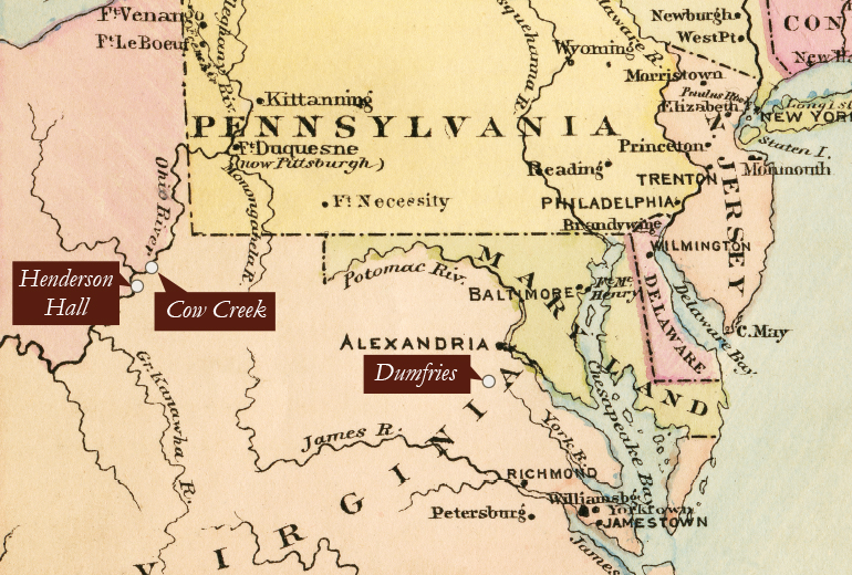 Alexander Henderson Sr received bounty land warrants based on his service during the American Revolution. From 1779–1783, he purchased 29,037 acres in 51 transactions including 2,300 acres in western Virginia, where his sons would settle on the frontier. His sons Alexander Jr, John Glassford, and James moved from Dumfries to western Virginia, settling in present-day Wirt, Wood, and Pleasants County. Alexander Jr would become the progenitor of the Henderson family in West Virginia.